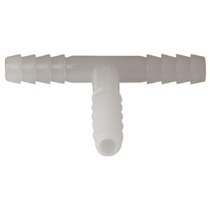 An inline “T” fitting is useful to divide gas flow in more than one direction. This nylon “T” fitting splices a 3/8″ I.D. vinyl hose to a 3/8″ I.D. vinyl hose.